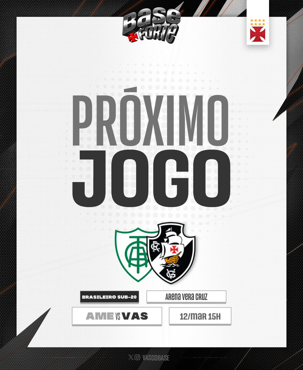 EsportesFutebolVascoVasco Sub-20: Vasco estreia no Brasileiro contra o América em Betim nesta 4ª-feira às 15h março 12, 2025 admin Vasco Base @vascobase Os #MeninosDaColina do Sub-20 voltam a campo nesta quarta-feira (12), às 15h, para enfrentar o América-MG pela primeira rodada do Campeonato Brasileiro da categoria! 💢 #BaseForte #VascoDaGama Fonte: X oficial Vasco Base