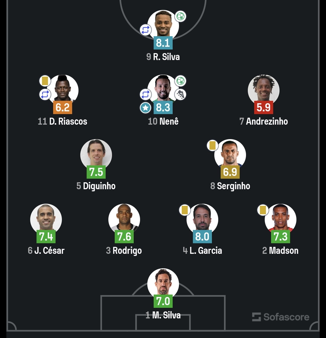 O placar foi 2 a 0 e os gols foram marcados por Rafael Silva e Nenê.