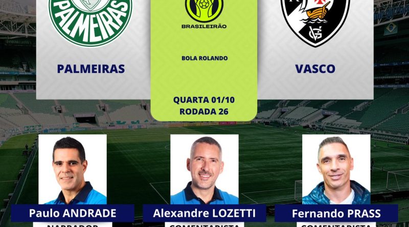 EsportesFutebolVascoVasco Confira os profissionais que trabalharão na transmissão de Palmeiras x Vasco outubro 1, 2025 admin Bola Rolando @BolaRolandoBr_ ⚽️🇧🇷 #Brasileirão | Rodada 26 ⚔️ #Palmeiras x #Vasco 🎙️ Narrador: Paulo Andrade 🎙️ Comentaristas: @Ale_Lozetti – @Fernando_Prass 📺💻📱 @canalpremiere Siga nosso perfil e dê RT 🔃 Fonte: X Bola Rolando