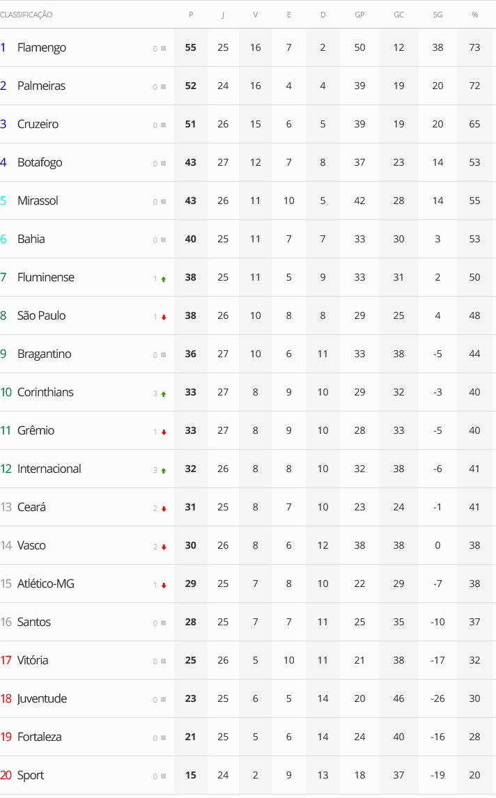 Quatro jogos abriram a 27ª rodada do Campeonato Brasileiro neste sábado. O Vasco, que enfrenta o Vitória neste domingo em São Januário, está em 14º lugar.