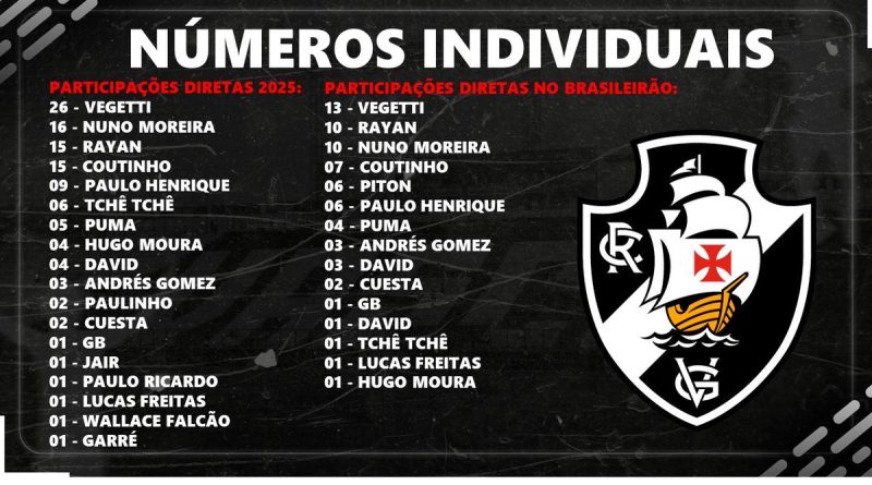 Hoje no Bom Dia Gigante trouxe números individuais dos jogadores do Vasco em 2025 e no Brasileiro, com gols e assistências. Nesse slide, coloquei a soma de cada em participação direta em gols. É bacana de ver que o trabalho do Diniz faz com que muitos estejam na relação.