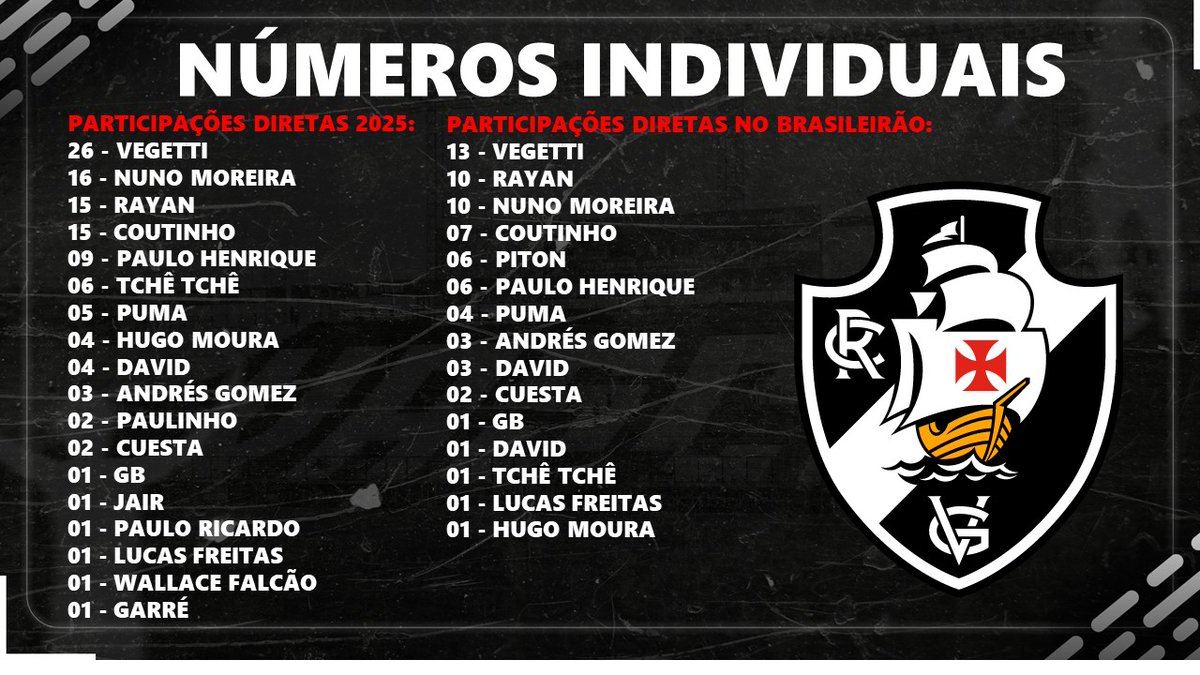 Hoje no Bom Dia Gigante trouxe números individuais dos jogadores do Vasco em 2025 e no Brasileiro, com gols e assistências. Nesse slide, coloquei a soma de cada em participação direta em gols. É bacana de ver que o trabalho do Diniz faz com que muitos estejam na relação.