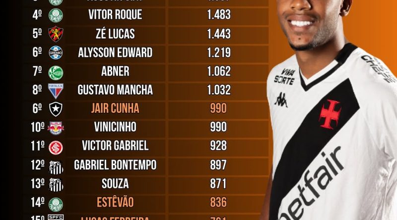 O atacante Rayan, do Vasco, é o jogador com até 21 anos com mais minutos jogados no Brasileirão 2025. Ele fez 25 partidas e marcou 9 gols, em 2.039 minutos.