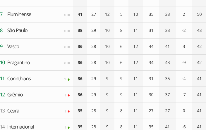 Os resultados da 29ª rodada do Brasileirão ajudaram ao Vasco na luta na parte de cima da tabela. Com as derrotas do São Paulo, Grêmio e Ceará, o clube não foi ultrapassado por nenhum concorrente, se manteve na nona posição e pode pular para oitavo caso vença o Fluminense nesta segunda-feira, às 19h30, no Maracanã.