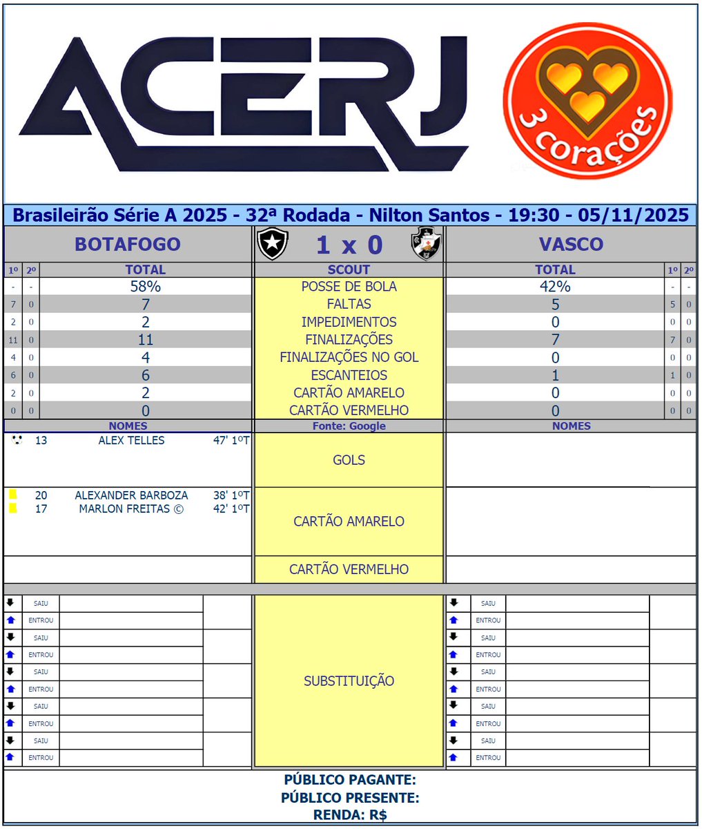 Scout do 1º Tempo de Botafogo e Vasco pela 32ª Rodada do Campeonato Brasileiro 2025 no Nilton Santos (Fonte: Google) #Acerjinforma #brasileirao2025 #BOTxVAS #Botafogo #VascodaGama @Brasileirao @Botafogo @VascodaGama