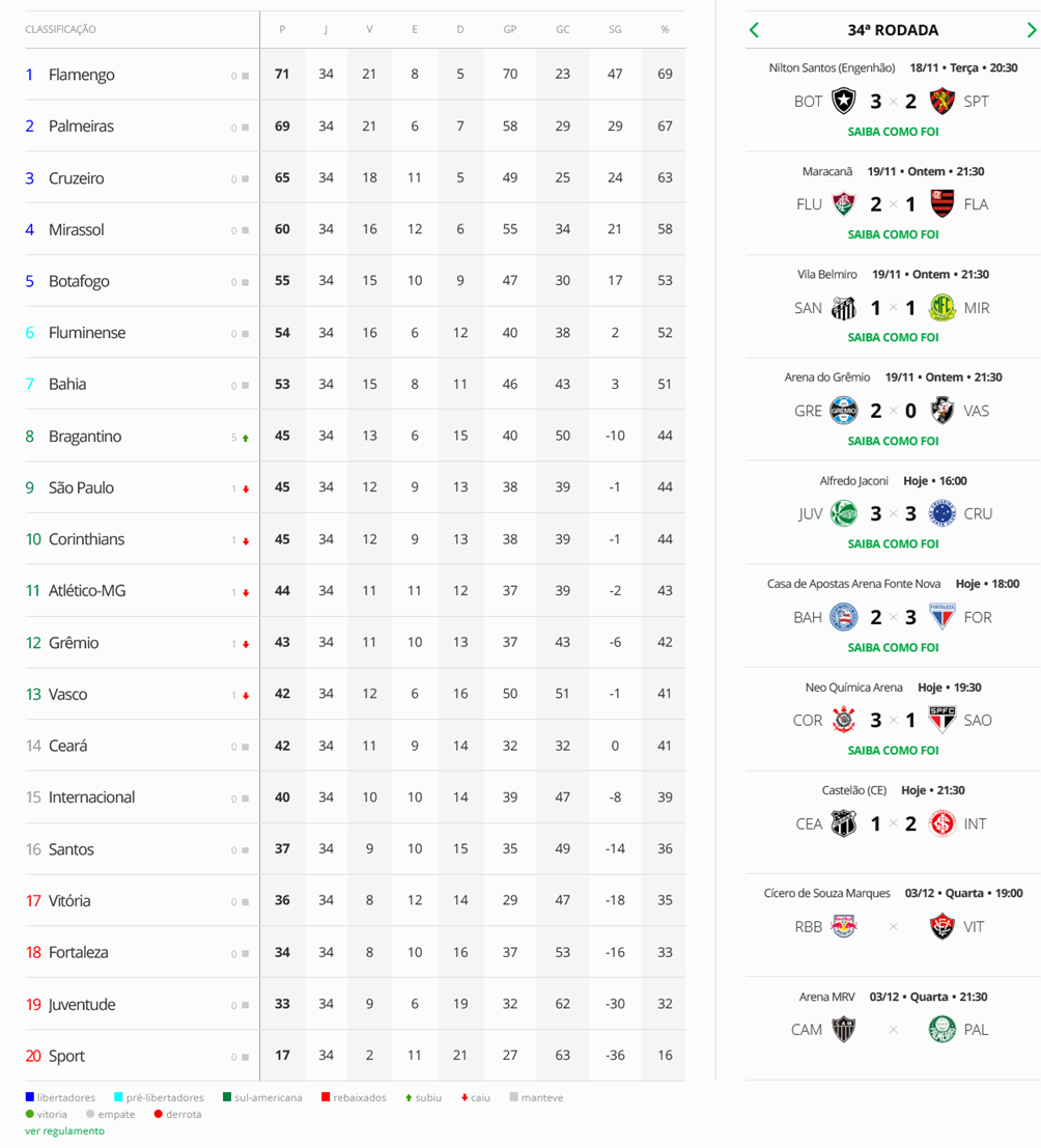 A 34ª rodada do Campeonato Brasileiro teve continuação nesta 5ª-feira com 4 jogos. O Vasco caiu para a 13ª colocação e está 6 pontos acima da zona do rebaixamento.