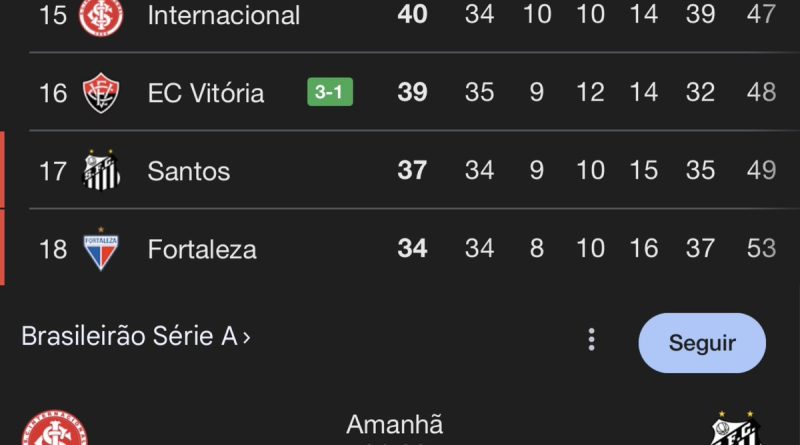 É… O Vitória venceu o Sport por 3×1 e jogou o Santos de volta para a zona de rebaixamento.